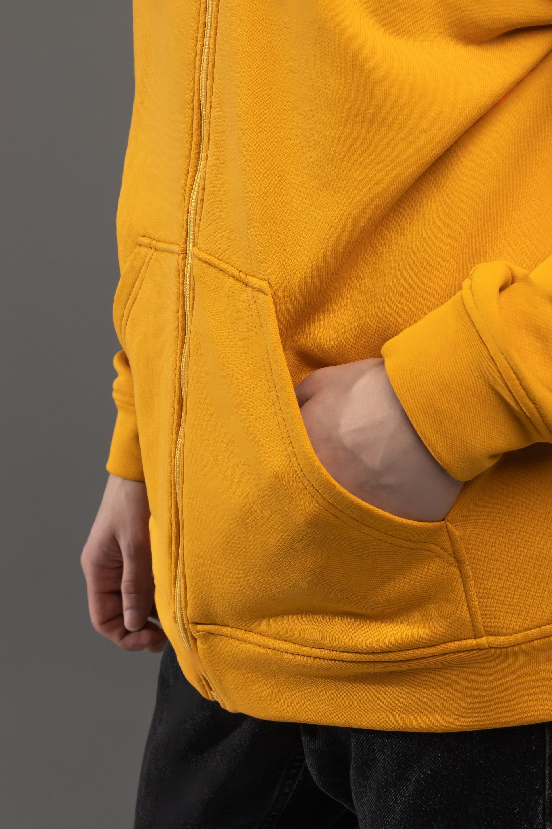 Это толстовка на молнии прямого кроя, с капюшоном, втачными рукавами и накладным карманом. Двойная отсрочка швов, отделка из кашкорсе.